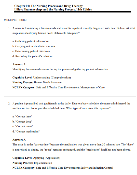 The test bank follows the structure of Lilley’s 11th edition across all major pharmacological categories and nursing process applications, including: